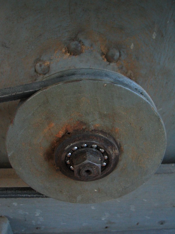 The pully on the motor is metal but the one on the saw end has been made out of some kind of hard wood. Carriage bolts hold the bearing hub to the wooden wheels of the band saw. Old rubber belting was attached to the wooden wheels for tires.