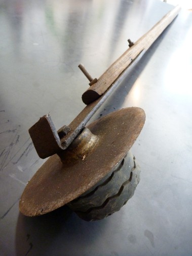 I think what amazed me the most about this was the fact that it was hand made. Someone had taken some steel cut it into a circle, bent some metal rod, brazed some pipe and cut some old tire tread out and threw together this beauty. Most people would never look twice at this. It is hard to imagine how rich they must have been back then to be able to take the time to even make something like this. These days we barely have time to run to CT or HD every spring to buy the same thing new since the handle broke off the one we bought last year. The strange thing about this tool is they do still make them. My guess they are cheap as hell and often break on the way home from the store. Yet here is this guy with, no computer, no plastic injection machine, or cnc mill, makes this one and it still works fifty or more years later. The worst part is it will still work for another 50 years no problem. I bet the neighbors have gone through ten newer, factory made, ones since this was built. Life is weird.